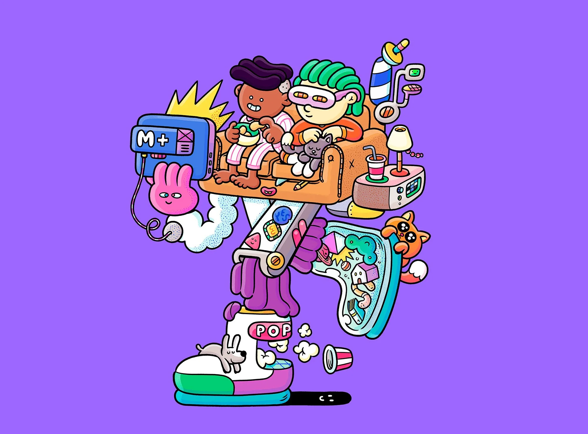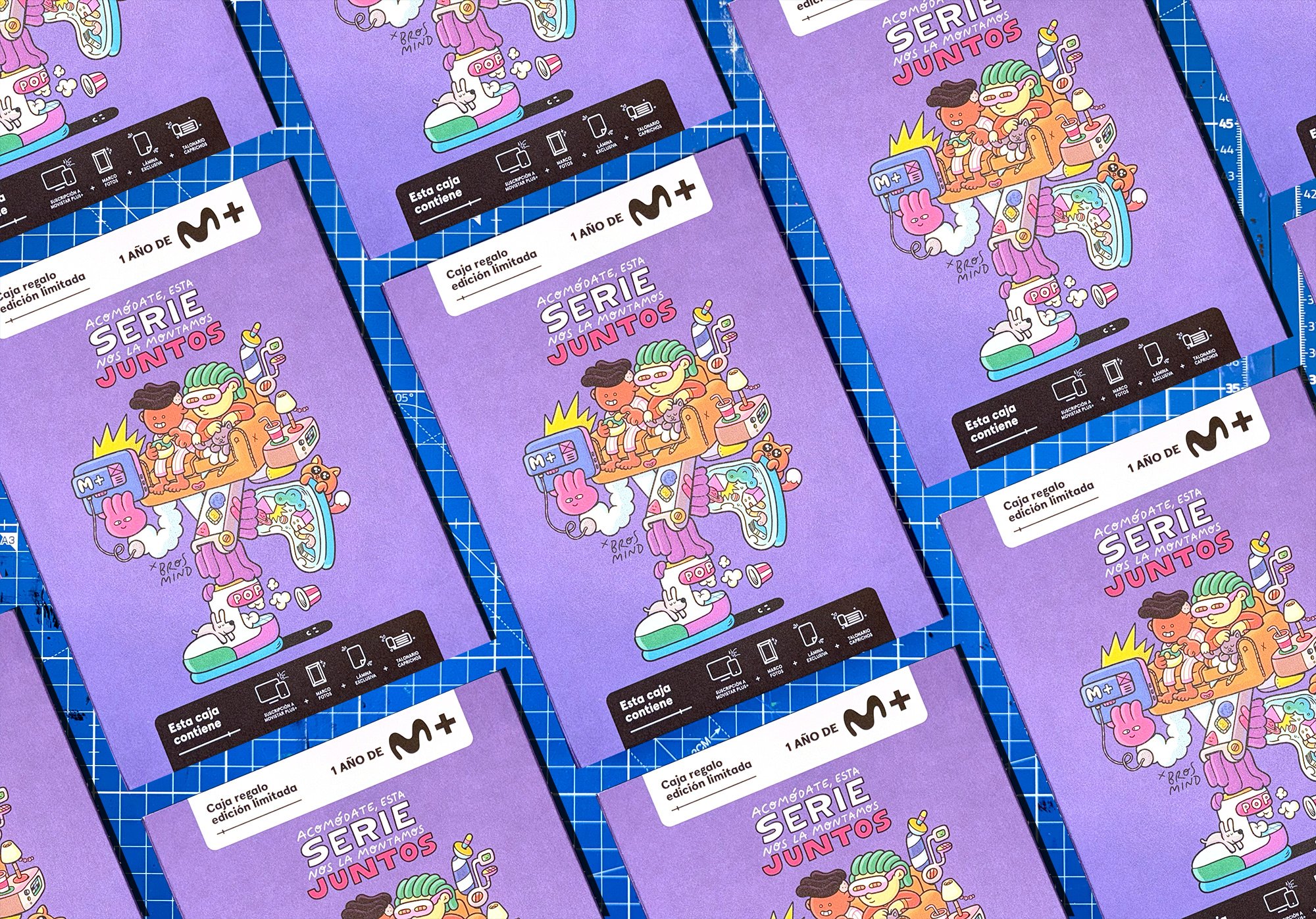 We were selected as one of the artists to create the illustrations for Movistar Plus+ gift cards. The project included a main illustration for the pack, as well as a series of smaller illustrations for a “voucher booklet,” featuring playful ideas for activities with the person receiving the gift.