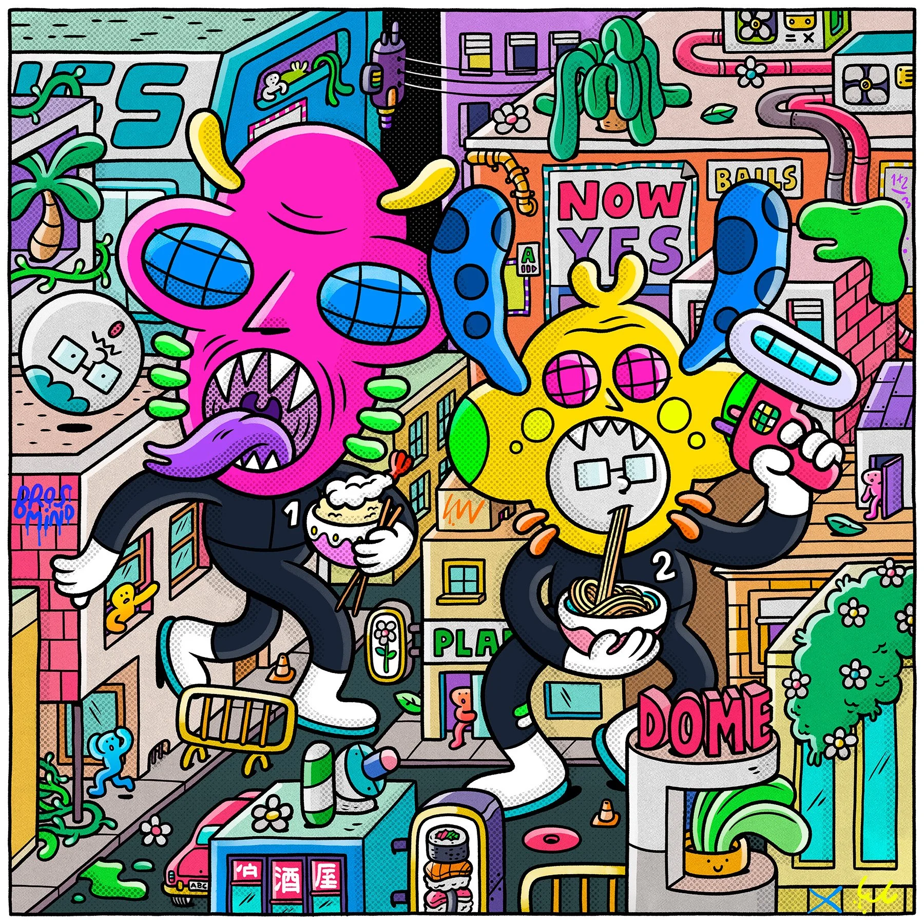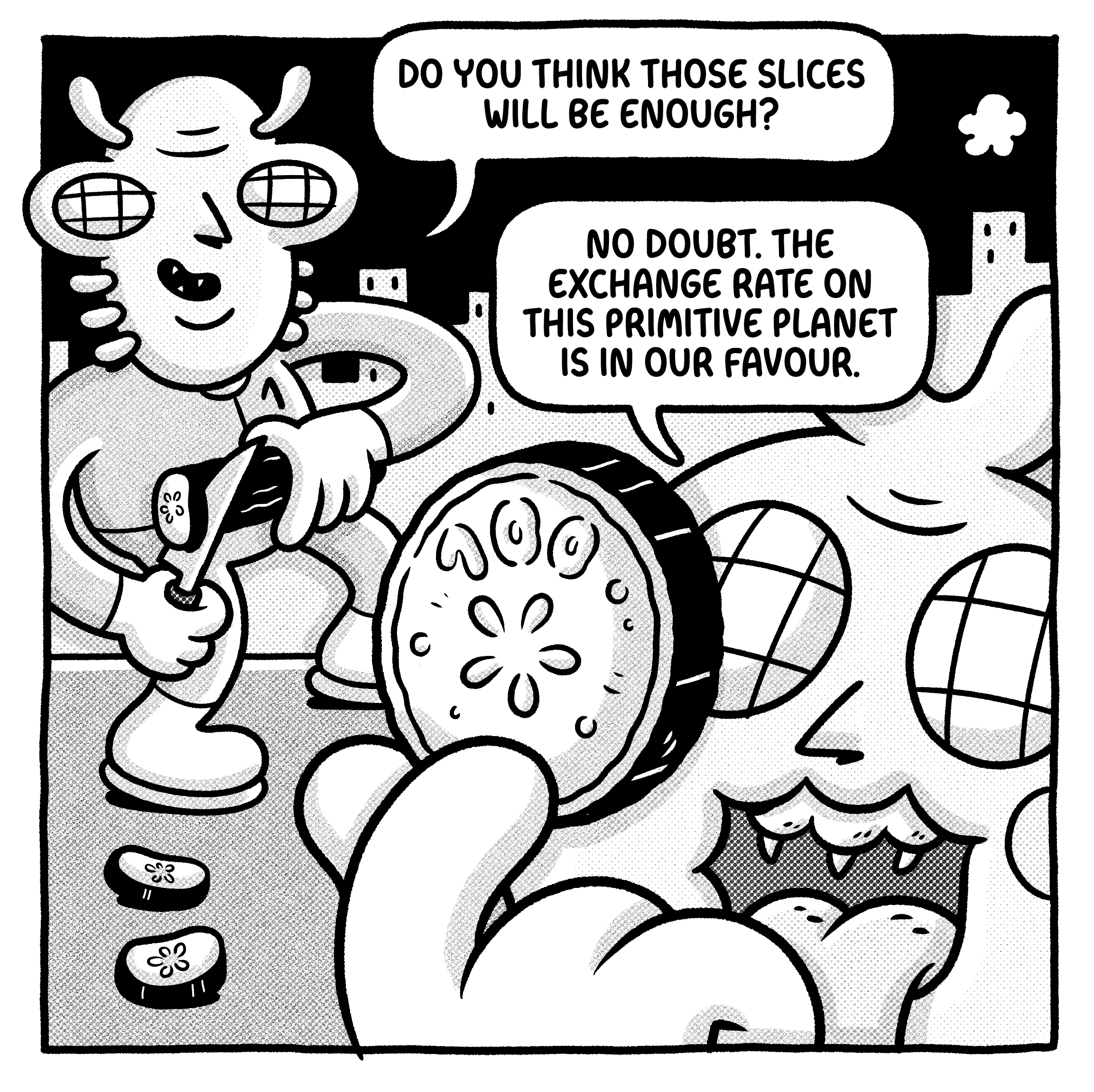 Meet these two vegetable-based alien agents who have come to Earth to supervise the colonization progress of their vegetable empire. To their surprise, they discover that, contrary to their expectations, vegetables are not ruling this planet—mammals are. Yuck! Luckily, they brought their special weapons, whose beams can neutralize mammals by transforming them into spheres, which they can later put in their mouths to assimilate some human abilities. Using this camouflage, they begin enjoying human culture, especially the food, which ultimately distracts them from their conquering plans. Pepita's Plant Shop is the name of the little shop they turn into their headquarters, since they are experts in plant care and it serves as the perfect cover.