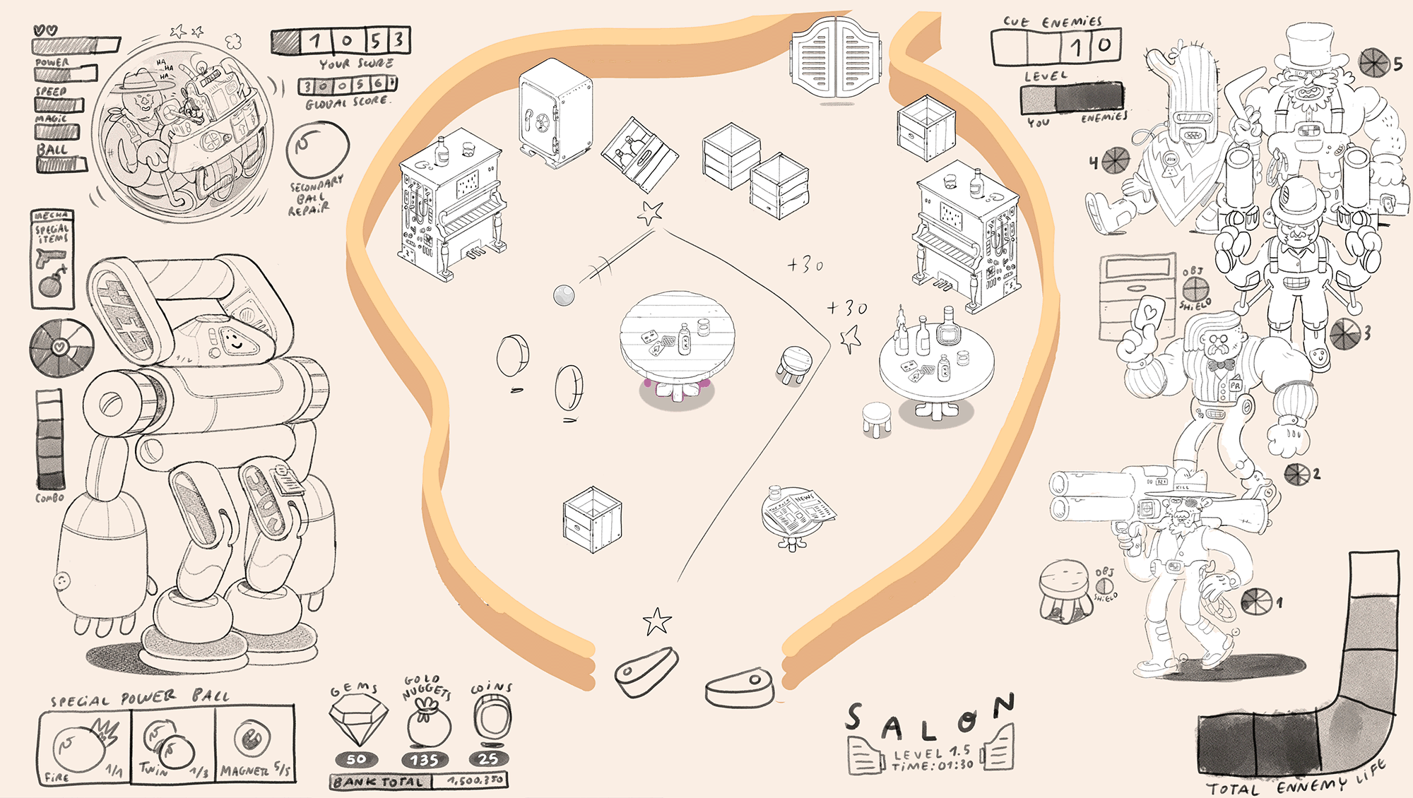 We developed that world with great attention to detail and depth. In addition to writing the story, we designed different types of technology, character archetypes, means of transportation, and maps. We also produced numerous concept drawings to support the creation of the game’s different levels. These explored settings, perspectives, the structural layout of the tables, and possible interactions between the ball and the environment.